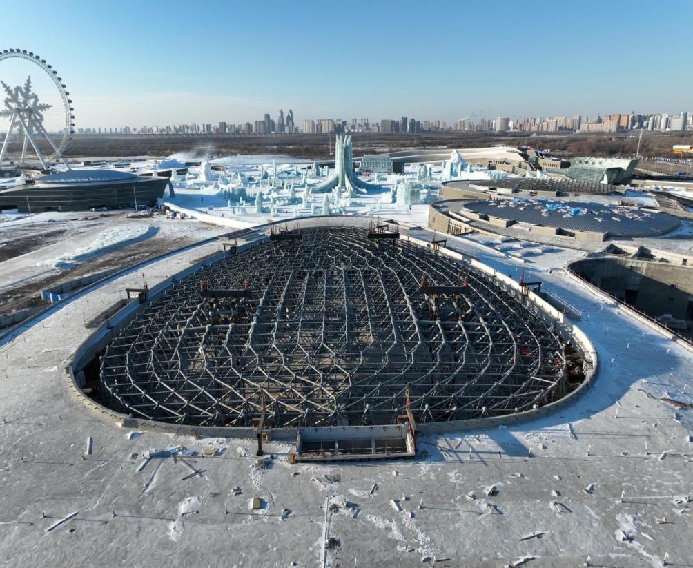 哈爾濱冰雪大******四季冰雪南館焊接球網(wǎng)架整體提升1500噸
